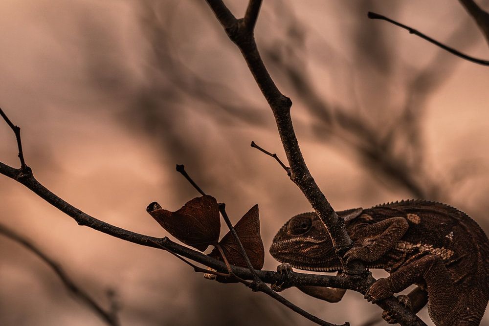 A chameleon tries to sit completely still, taking on the colour of the only two dry leaves on the bush, in lieu of more foliage to hide itself.
