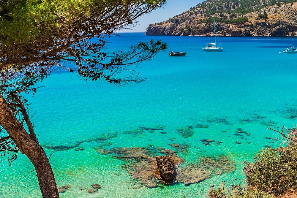 Beautiful view of Camp de Mar bay, idyllic seaside on Majorca, Spain Mediterranean Sea, Mallorca, Balearic Islands, Balearic Sea, Mediterranean Sea, Spain