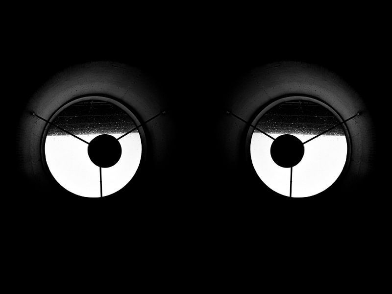 A skylight, mirrored in Photoshop, transforms into an image that feels like a pair of eyes. The symmetry and strong black and white contrast give this photograph a surrealistic look. Once you see it, you can't ignore it: a gaze that looks back and holds your attention. Minimalistic, mysterious and perfect as a statement piece on the wall.