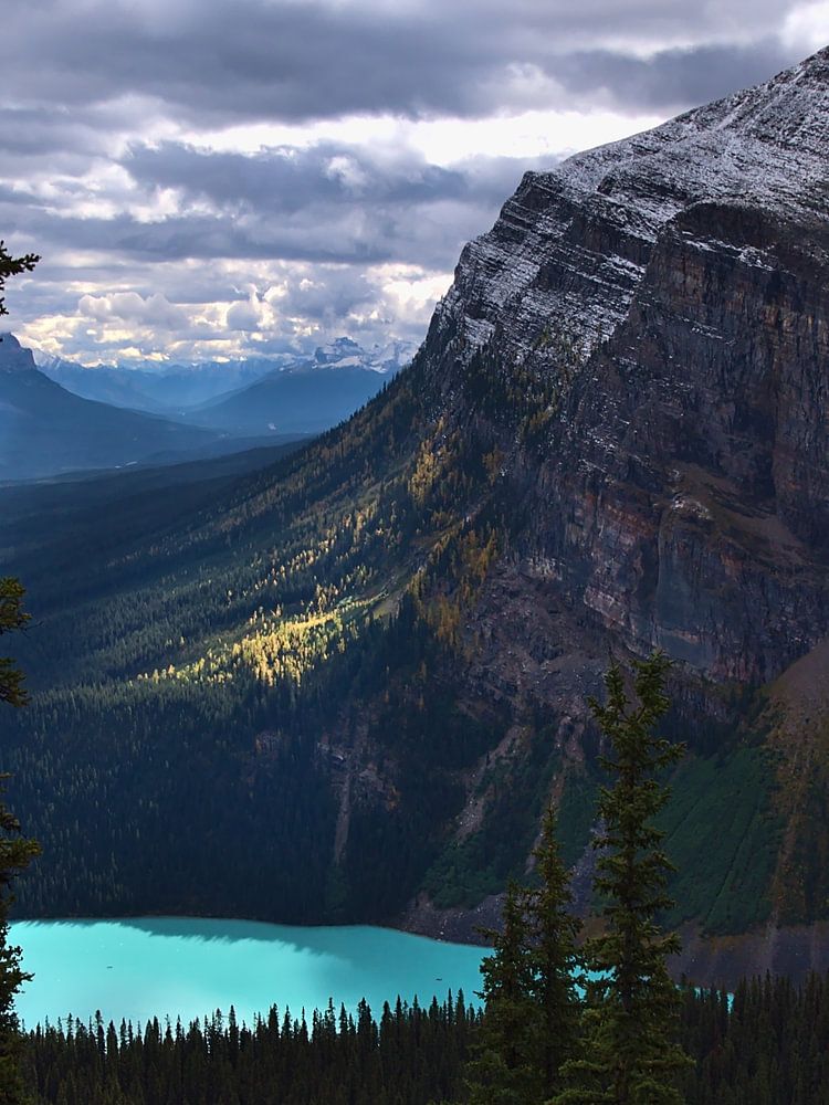 View of the famous Lake Louise with turquoise blue water in the snow-capped Rocky Mountains in Banff National Park, Alberta, Canada in North America in autumn with larch forests turning yellow on the slopes and dark conifers in the foreground.