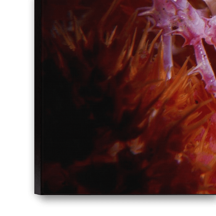 The pink/white Candy Crab (Hoplophrys oatesi) is a small crab, about 2–3 cm long, found in coral reefs of the Indian and Pacific Oceans. Its pink, purple, and white coloration provides excellent camouflage among soft corals, helping it stay hidden from predators.