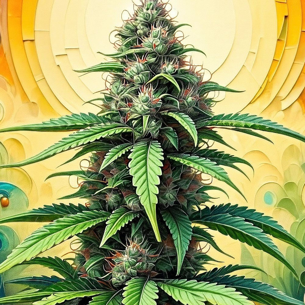 This skilfully designed work - some of which looks as if it has been painted by hand - unfolds a multi-layered homage to the cannabis plant and celebrates its natural majesty. A magnificently blooming cannabis plant is enthroned at the centre of the composition, its dense, resin-rich flowers rising majestically. It appears like a queen in the realm of botany, embedded in a lush, almost exuberant flora. A lively mosaic of colourful flowers and plants unfolds around it - an explosion of organic colour that captivates the eye and touches the heart.