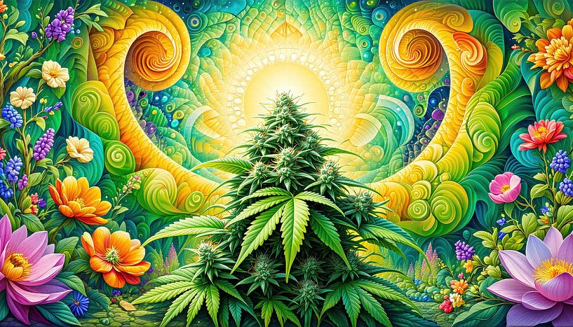 Buy this flower art Cannabis in the light of the green queen - A tribute to the cannabis plant as a symbol of vitality, diversity and the untamed beauty of nature by AidasignArt on canvas, ArtFrame, poster and wallpaper, printed on demand in high quality.