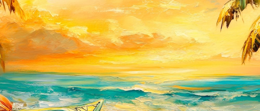 A gentle sunset bathes the scene in warm light as the waves roll gently onto the beach. A bright blue kayak awaits adventurers on the shore, surrounded by majestic palm trees that exude tropical flair. This relaxing artwork fits perfectly in the living room and brings a feeling of holiday and freedom to any room.