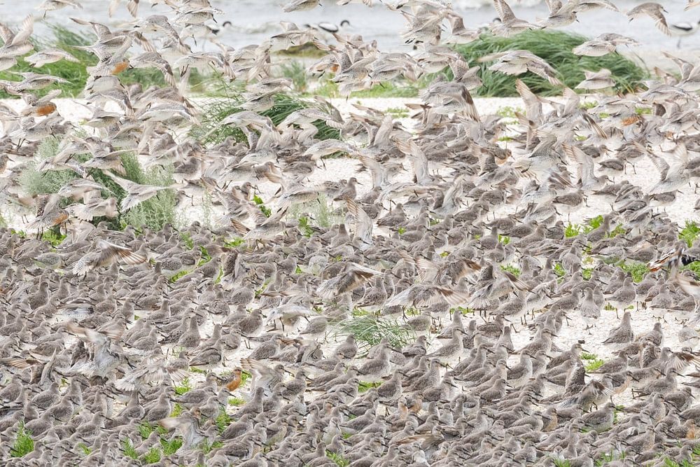 Canaries fly up over a high-tide refuge in the Wadden Sea. An oystercatcher comes around the corner and shelducks continue to forage in the green glasswort.