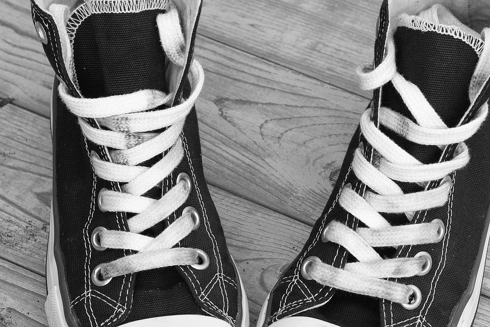 Detail of retro canvas sneaker shoes on vintage wooden background. Grunge teen rock style.