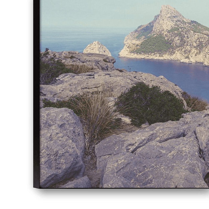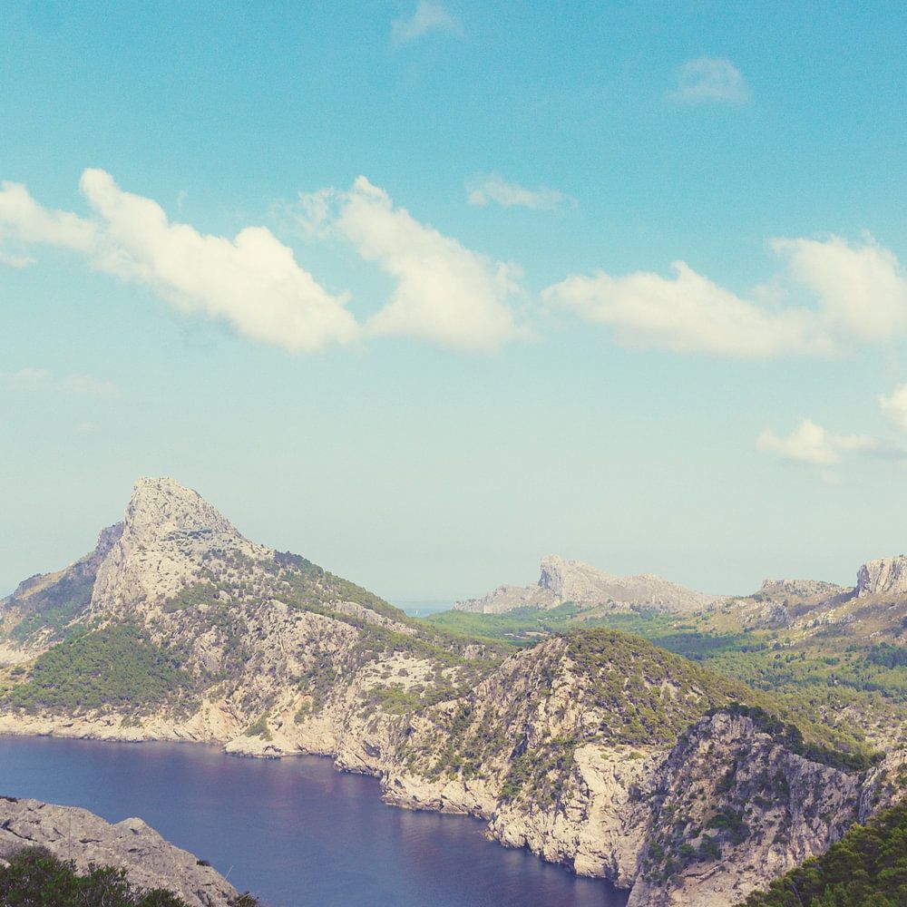 A breathtaking view of the rugged mountains in the north-west of the island of Mallorca, which meet the vast Mediterranean Sea under a bright blue sky. The coastline is dotted with lush greenery and rock formations.