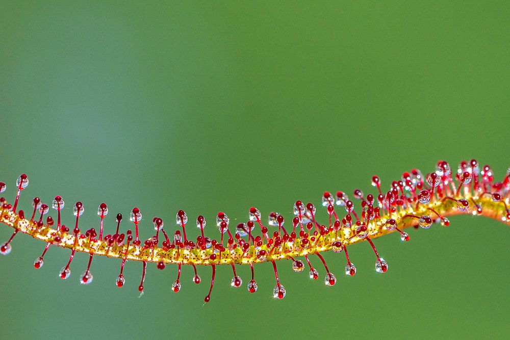 Cape Sundew (Drosera Capensis), meat-eating plant. The drops reflect the greenhouse of the botanical garden of Leiden.