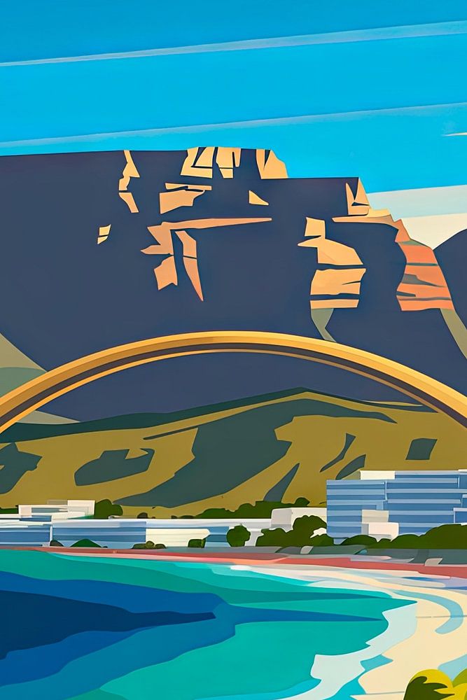 A radiant coastal view opens up under a bright blue sky, surrounded by majestic mountains. The gentle sweep of the road invites you to explore, while the sparkling waters of the bay play with vibrant colours. A harmonious blend of nature and urbanity reflects the vibrant life of Cape Town - a true paradise for explorers!