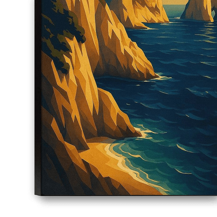 This Capri Art Deco poster celebrates the island’s legendary beauty with a bold and stylish design. The artwork focuses on the iconic Faraglioni rocks rising majestically from the deep blue Tyrrhenian Sea, illuminated by golden rays of sunlight. Cliffs and beaches frame the scene, creating a perfect balance between natural grandeur and stylized vintage elegance. In the golden age of travel, posters like this captured the essence of Mediterranean escapes, and this design continues that tradition with a contemporary twist. Capri, long cherished by artists, writers, and travelers, embodies timeless romance, crystal-clear waters, and vibrant island life. This print brings those elements into a striking composition that enhances any living space. Whether displayed in a modern apartment, a coastal home, or a vintage-inspired interior, this Capri wall art creates an atmosphere of serenity and adventure. Ideal for collectors, travel lovers, and anyone inspired by Italy’s unforgettable landscapes.