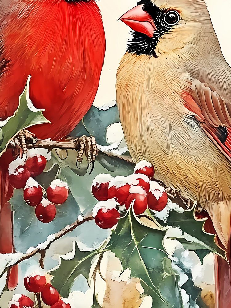 Buy this bird art Cardinals On Holly by haroulita on canvas, ArtFrame, poster and wallpaper, printed on demand in high quality.