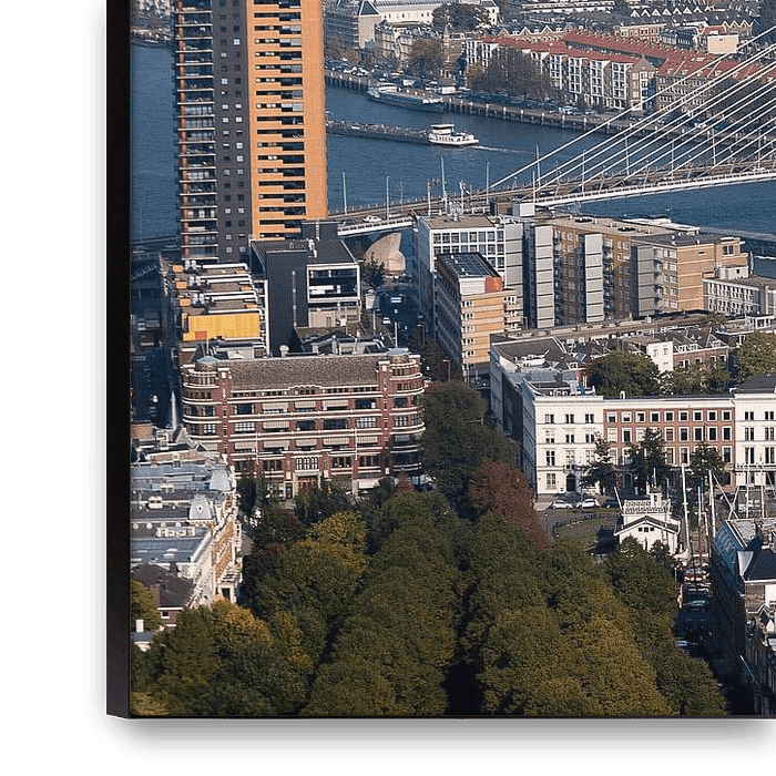 Rotterdam skyline on De Maas seen from above with skyscrapers and urban development around the inland waterway route