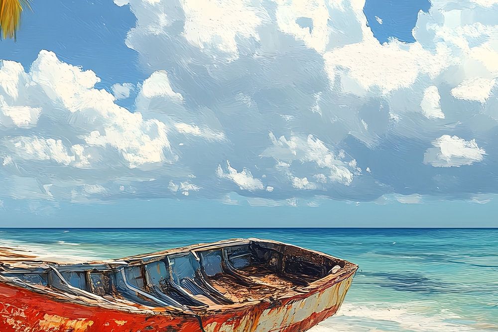 The oil painting captures the quiet yet impressive beauty of a Cuban beach, dominated by an old red boat resting lonely on the white sand. The peeling colour of the boat tells stories of past adventures and lends the scene a nostalgic touch.