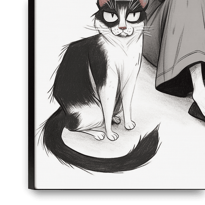 This caricature of an old woman with her cat immediately evokes a smile. The woman, with her unique facial expression, is rendered with an exaggeration of her characteristic features, with her wrinkles and glasses comically emphasised. Her cat, sitting on her lap, watches the viewer with an equal dose of sarcasm and attention. The…