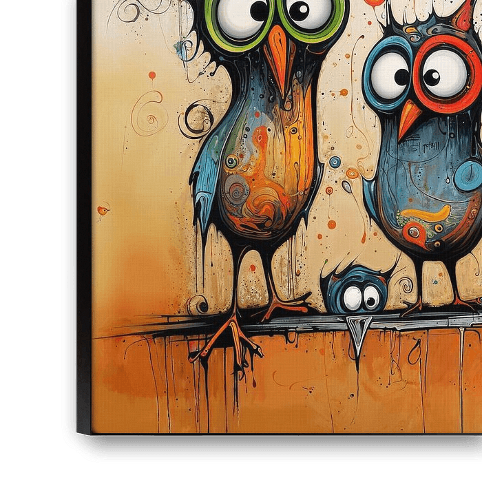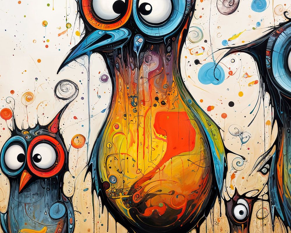 Caricature Bird Family - The work portrays a charming collection of caricatured birds, each with their unique, expressive facial expressions and playful posture, against a subtle background that does not draw attention away from these characterful figures. The vibrant colours - warm orange and earth tones mixed with accents of blue and green - bring this piece to life, while the playful splashes and detailed patterns give it a dynamic, almost vibrant texture.