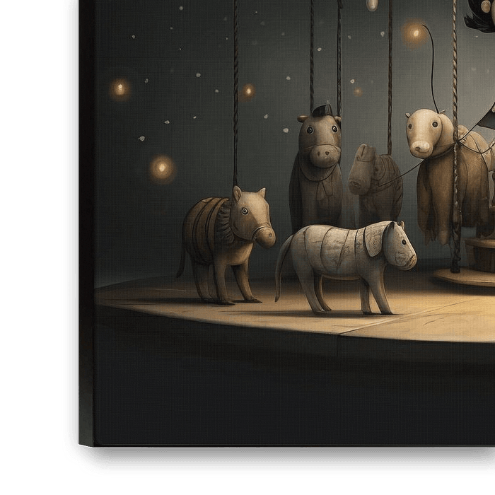 Enter the enchanting world of this illustration, where a boy, is the stable master and forms the heart of a carousel, surrounded by standing animals dancing to melodies. The merry-go-round not only brings joy and movement, but also a symphony of sound and colour. This artwork captures the moment when the boy and his animal friends share the magic of the carousel together.