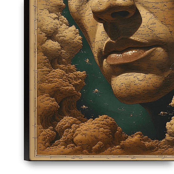 An imaginative and surreal digital portrait of a man's face, with his skin replaced by an antique map. The intense blue eyes contrast against the earthy tones of the map, surrounded by dramatic, cloud-like textures.