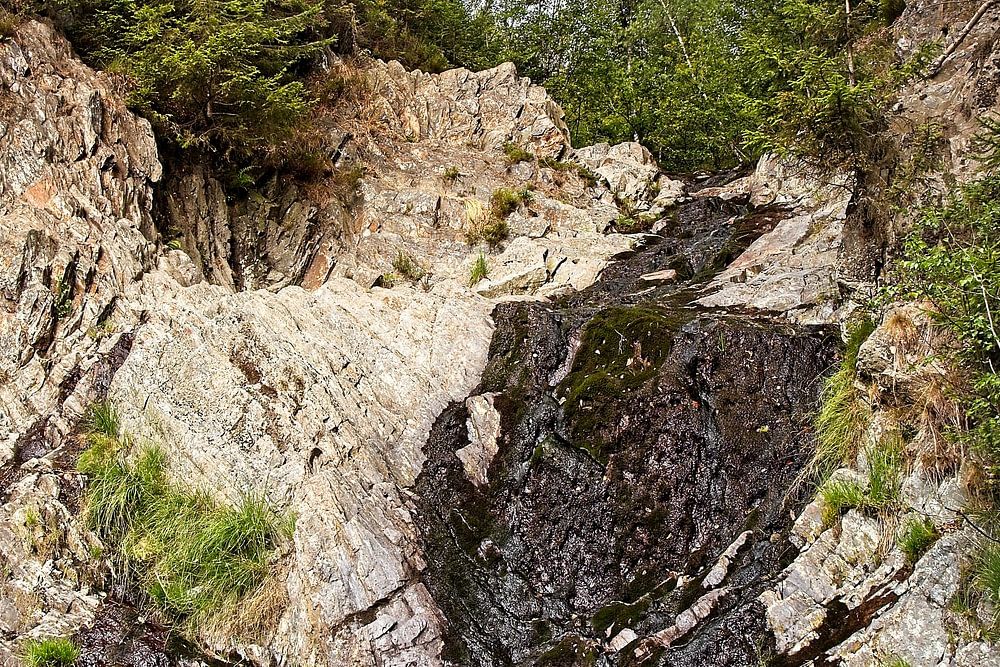 Only a small jet of water runs down the Bayehon waterfall in the Belgian Ardennes near Longfaye during the dry summer.