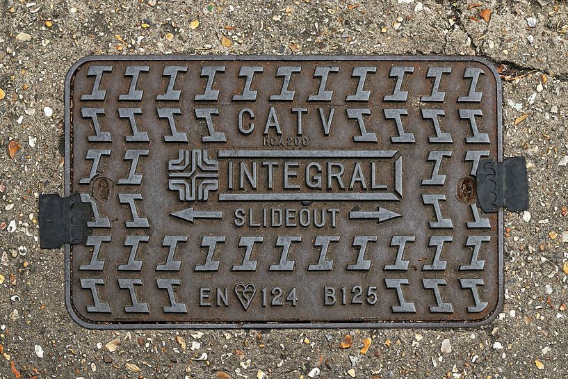 A metal pipe cover in Salisbury, with technical markings and a repeating pattern. Letters, arrows and relief are designed for practical use, but together they form a powerful image. Rust and wear soften the surface and add layers.