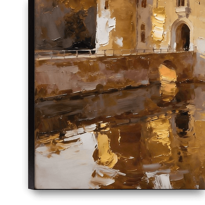 A grand castle rises majestically, encircled by shimmering waters that mirror its elegance. Its slender turrets reach gracefully toward a sunset sky, where warm golden hues blend seamlessly with soft amber and rose tones. The rich reflections in the surrounding moat amplify the castle’s regal presence, creating a serene and captivating…