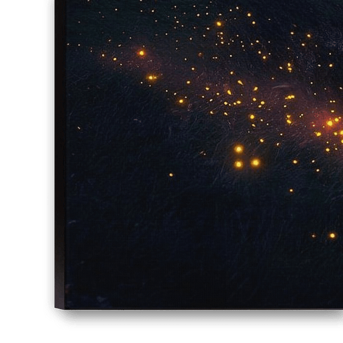 The sky shines in magical colours over a mystical castle perched majestically on a cliff. The golden lights along the footpath lend the scenario a dreamy atmosphere. This impressive composition fits perfectly into a living room, where it creates conversation and inspiration for adventure.