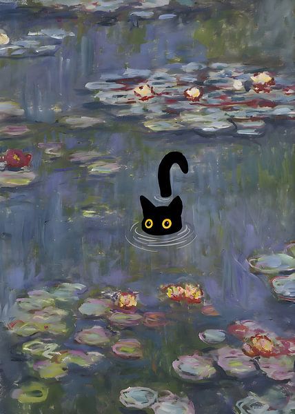 Cat Print Monet Water Lilies. This playful artwork features a cute black cat gliding through a vibrant, dreamlike pond. With its bright yellow eyes peeking above the water and its tail held high, the scene creates a charming and humorous contrast against the soft, colorful reflections surrounding it. The piece blends calm, imaginative,…