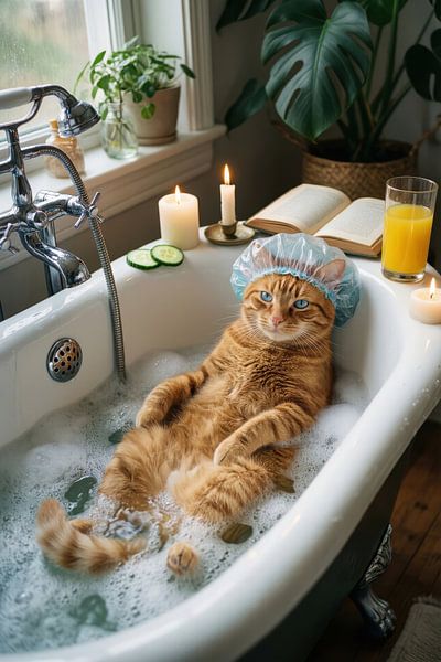 An orange tabby cat lounges in a foamy clawfoot tub, wearing a pale blue shower cap as soft window light fills the room. Candles, cucumber slices, an open book, and a glass of orange juice turn the scene into a playful at-home spa moment.