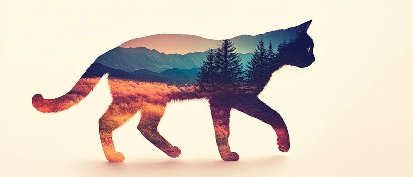 A fascinating interplay of colours and shapes unfolds in this composition, where the silhouette of a cat merges gently with nature. The lively landscapes and tranquil mountains radiate a harmonious calm that fits perfectly in the living room to create a relaxed and inspiring atmosphere.