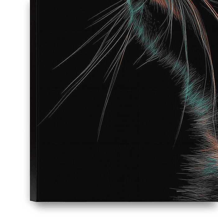 Cat head neon portrait painting immediately sets the tone with a powerful and modern design that perfectly matches its striking title. This artwork shows the head of a cat in vibrant neon colours, beautifully highlighted against a deep black background. The bright colour accents stand out and create an almost luminous effect, giving the…