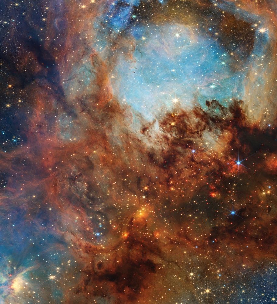 Using its powerful near-infrared camera, Webb focused on one "toe bean" of the paw print, revealing smaller circular structures filled with gas, dust, and newly formed stars. The image shows bright blue glowing areas where young, massive stars are actively shaping their environment by pushing away nearby gas and dust.