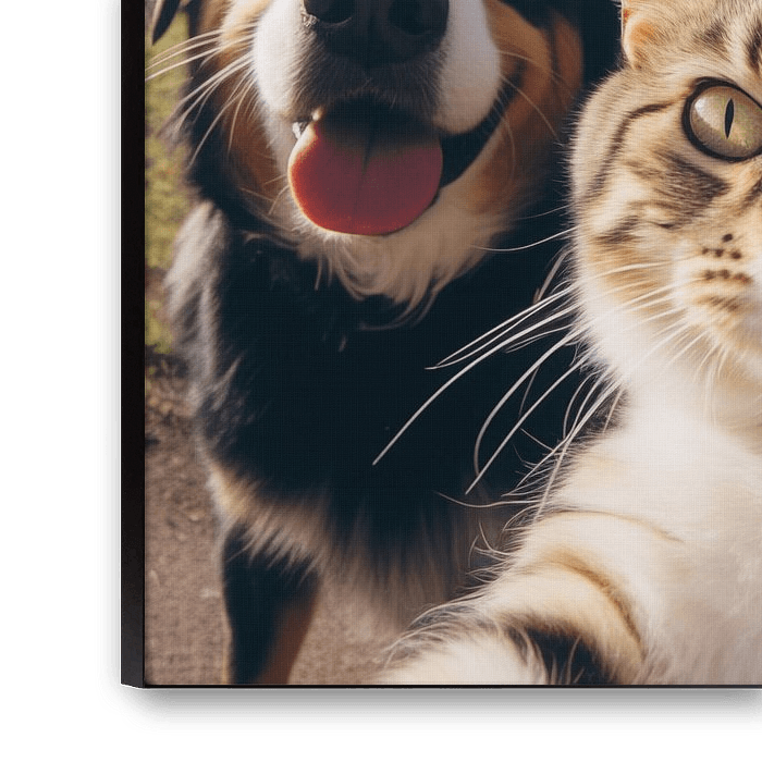 The cat is surrounded by three impressively large dogs looking curiously at the camera. The picture radiates a warm atmosphere. The animals appear to be peacefully and amicably united as they show off their different characters and size differences. It is a magical moment when the boundaries between the species disappear and they take a selfie together, sharing the joy of living together.