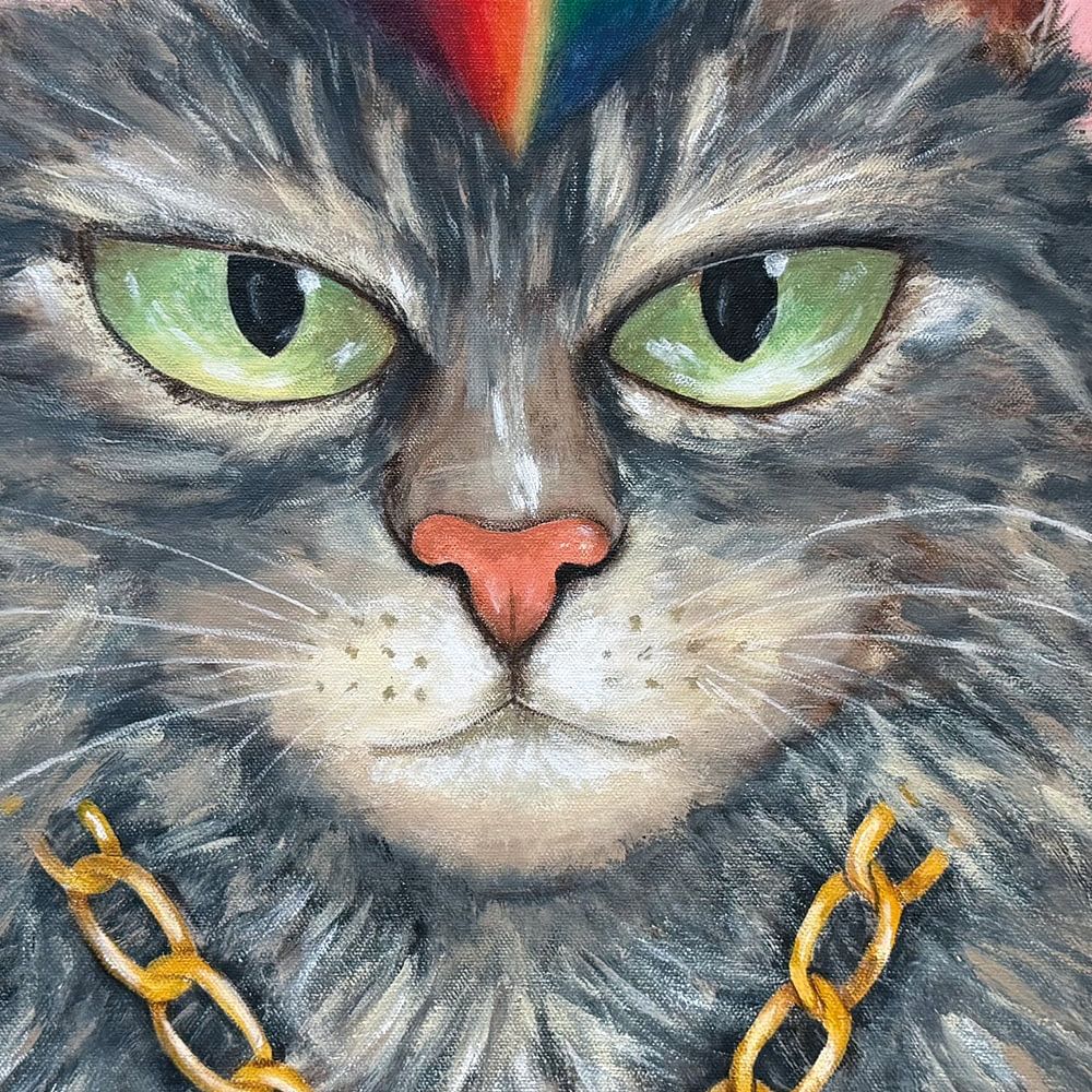 This is a sturdy long-haired cat who is nicely himself. Characteristic are his big rainbow cockscomb and gold chain. It may seem a bit imposing, but this furry friend has a heart of gold. It is an acrylic painting on canvas and made in 2025.