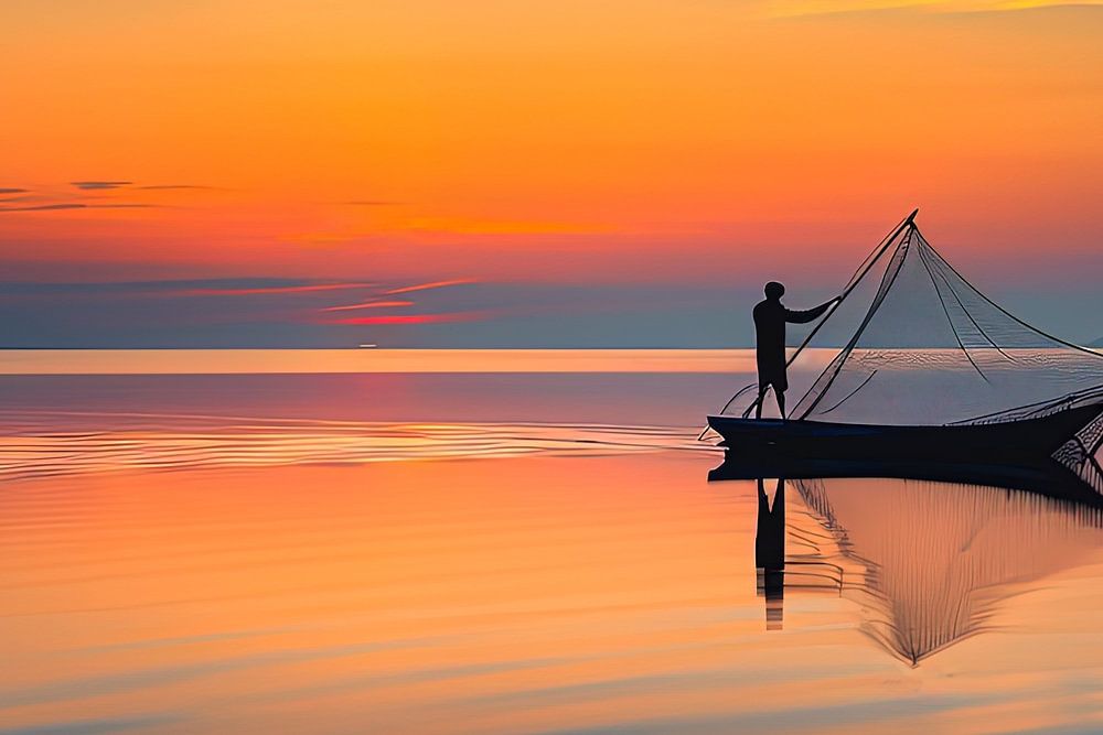 This soothing, peaceful artwork is a serene image of a fisherman casting his net on a mirror-smooth sea at the crack of dawn.