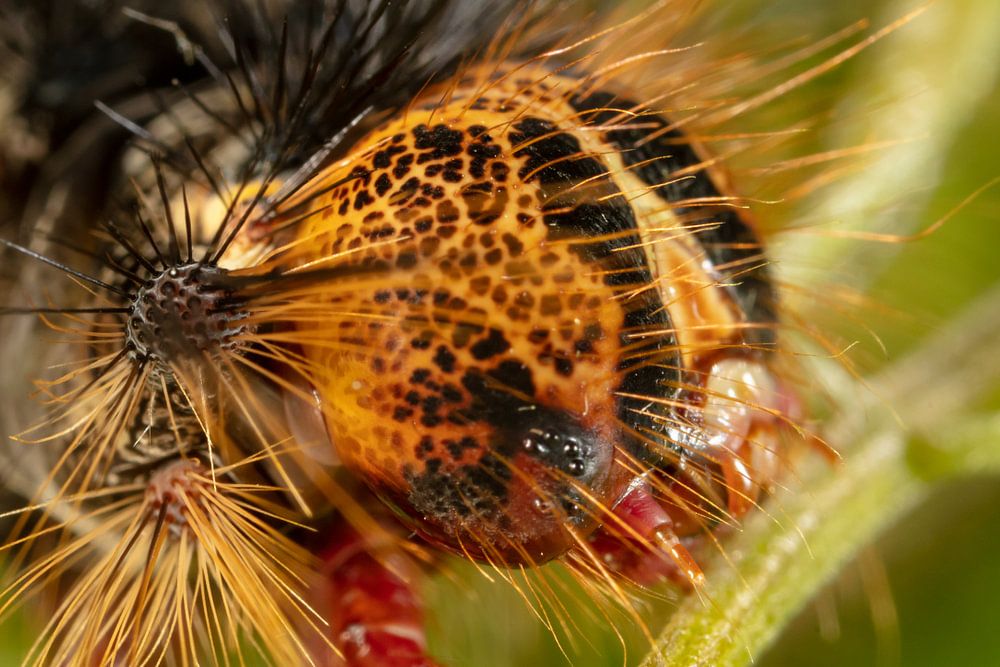 Caterpillar of the Plakker Nachtvlinder (Lymantria dispar) with large spines on green leaves.