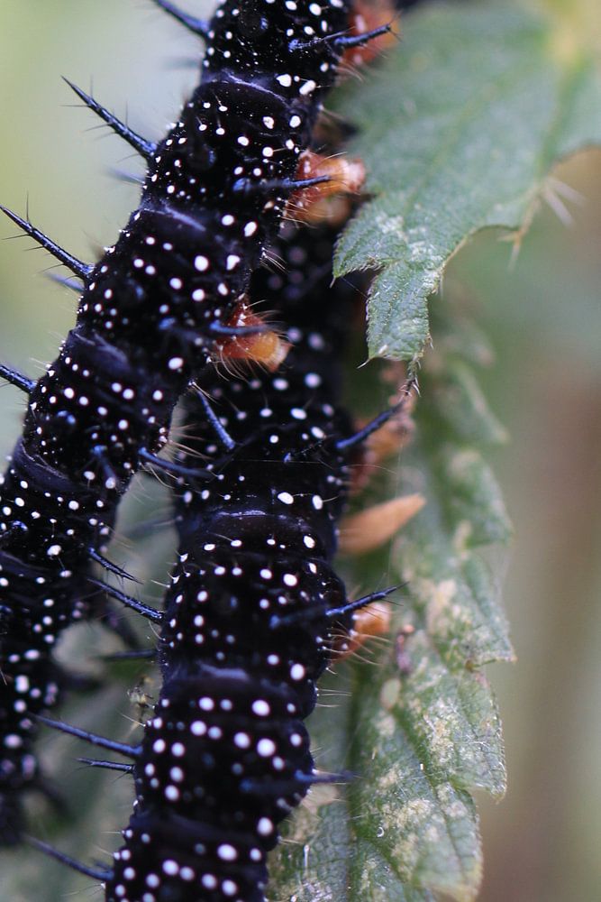 During a workshop in nature reserve De Groene Jonker I came across a large number of these caterpillars. Nice to see how they protect themselves against enemies with the spines on their skin. The funny brown legs contrast nicely with the black skin with white dots.