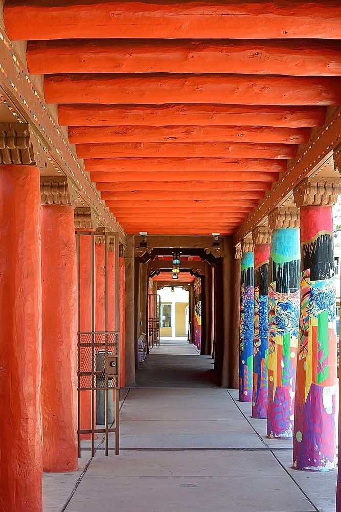 Loving all the colours and the overall atmosphere while walking around in the downtown area of the city of Santa Fe in New Mexico, USA. We really liked the colourful Cathedral Place passage.