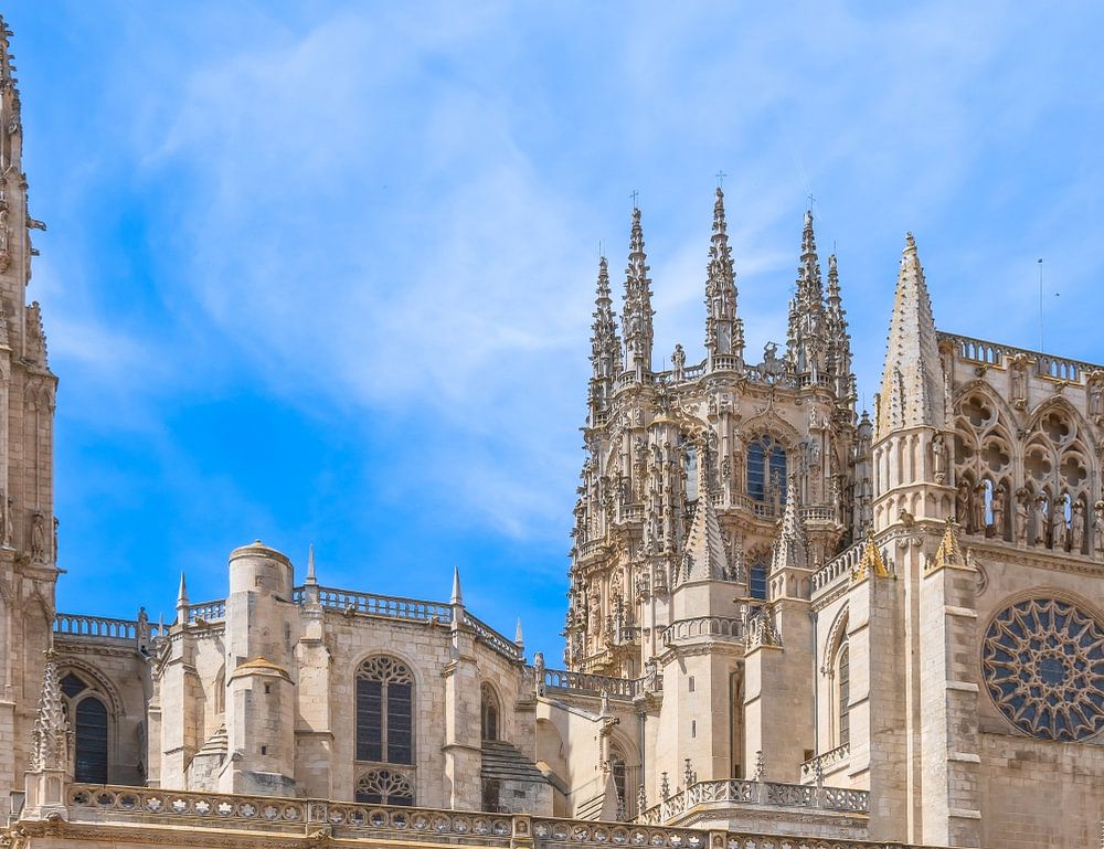 Santa Maria Cathedral, the Gothic cathedral is three-aisled, has transepts, many chapels, and a heavy quatre tower from the 16th century. Eight richly decorated turrets rise above it. The monumental west facade has two bell towers with openwork spires with saw-shaped profile. On the north side is the escalada dorada or golden staircase from the Renaissance period. The portal of the Sarmental (right transept, the cloister is adjacent to it) is well preserved. The sculpture in the tympanum is very realistic. Jesus teaches the evangelists and the apostles there. A long staircase between the sacristy and the cloister leads up to it. In the cathedral there are many works of art, funerary monuments, including those of "El Cid", altarpieces and a beautiful choir stalls. The chapel "del Condestabele" is octagonal, has eight small pointed towers and a rich wall decoration. The funerary monument of El Cid Campeador, the most famous son of Burgos, and Doña Jimena is located under the domed vault. The railings between transept and choir consist of beautiful wrought ironwork. The walnut chairs of the choir stalls are all different and have palmwood inlays.