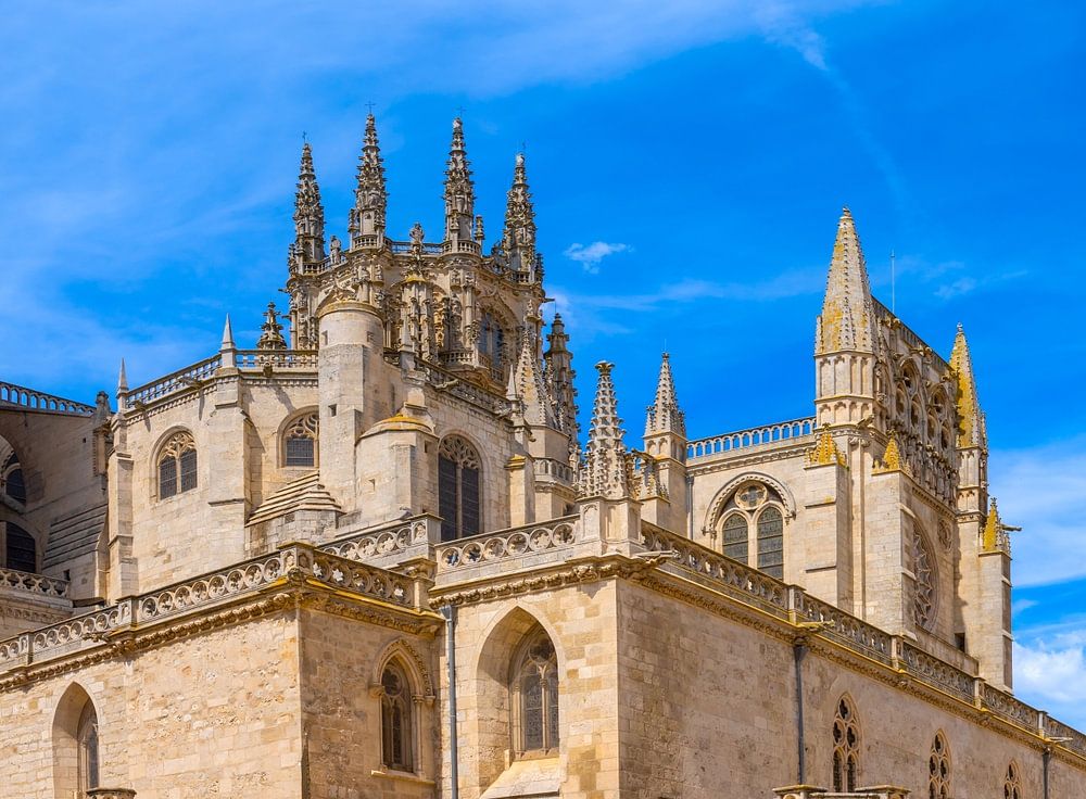 Santa Maria Cathedral, the Gothic cathedral is three-aisled, has transepts, many chapels, and a heavy quatre tower from the 16th century. Eight richly decorated turrets rise above it. The monumental west facade has two bell towers with openwork spires with saw-shaped profile. On the north side is the escalada dorada or golden staircase from the Renaissance period. The portal of the Sarmental (right transept, the cloister is adjacent to it) is well preserved. The sculpture in the tympanum is very realistic. Jesus teaches the evangelists and the apostles there. A long staircase between the sacristy and the cloister leads up to it. In the cathedral there are many works of art, funerary monuments, including those of "El Cid", altarpieces and a beautiful choir stalls. The chapel "del Condestabele" is octagonal, has eight small pointed towers and a rich wall decoration. The funerary monument of El Cid Campeador, the most famous son of Burgos, and Doña Jimena is located under the domed vault. The railings between transept and choir consist of beautiful wrought ironwork. The walnut chairs of the choir stalls are all different and have palmwood inlays.