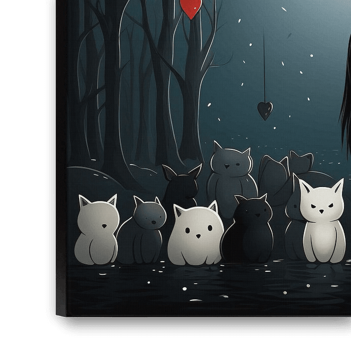 Walk along in a fairytale winter forest, where a girl is surrounded by cats of all shapes and colours. The sky is filled with floating hearts, giving the scene a warm and enchanting atmosphere, perfect for Valentine's Day. This illustration is not only a celebration of love, but also a wonderful addition to any nursery, where the imagination comes alive amidst cat magic.