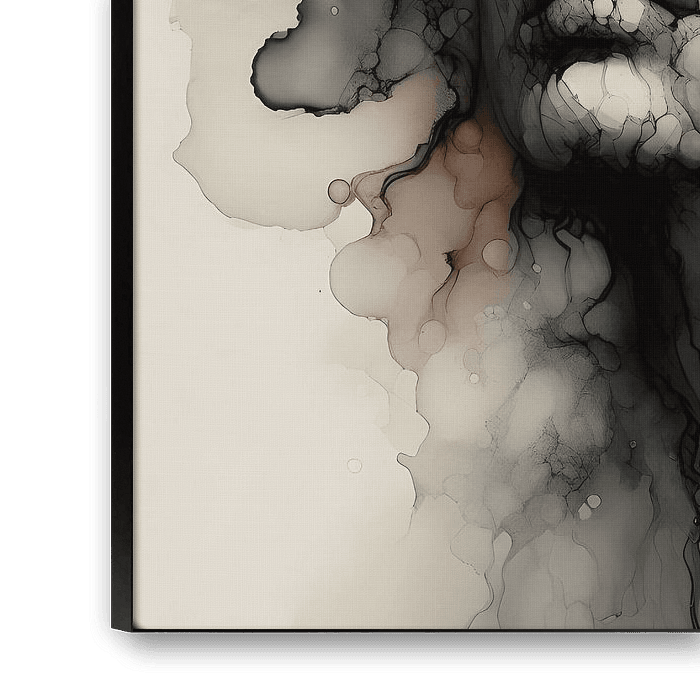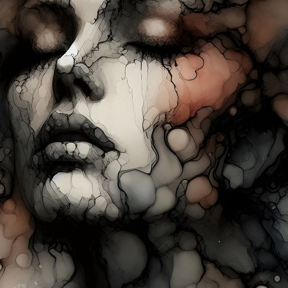 A dreamy watercolour shows a woman with long, flowing hair slowly merging into the background. Her hair blends with abstract shapes and lines, as if the painting and she are one. Soft shades of brown and pink flow effortlessly into each other, typical of the transparent nature of watercolour paint. Her face is only partly visible, enveloped in colour and atmosphere. The whole breathes vulnerability, warmth and a touch of mystery.