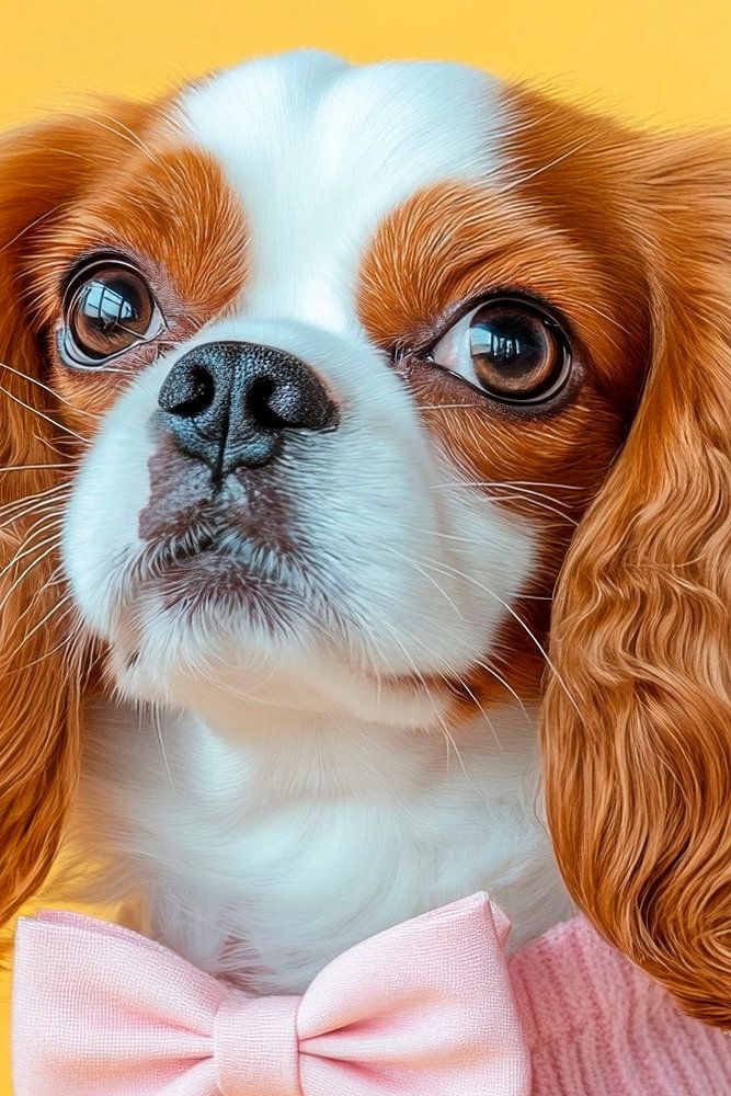 Soft, shiny ears frame a sweet face on which eyes shine like two shimmering buttons. Wearing a soft pink jumper and an elegant bow, this Cavalier King Charles Spaniel is not only charming but also extremely stylish. His inquisitive look tells of playful adventures and loyal friendship, in keeping with his royal heritage.