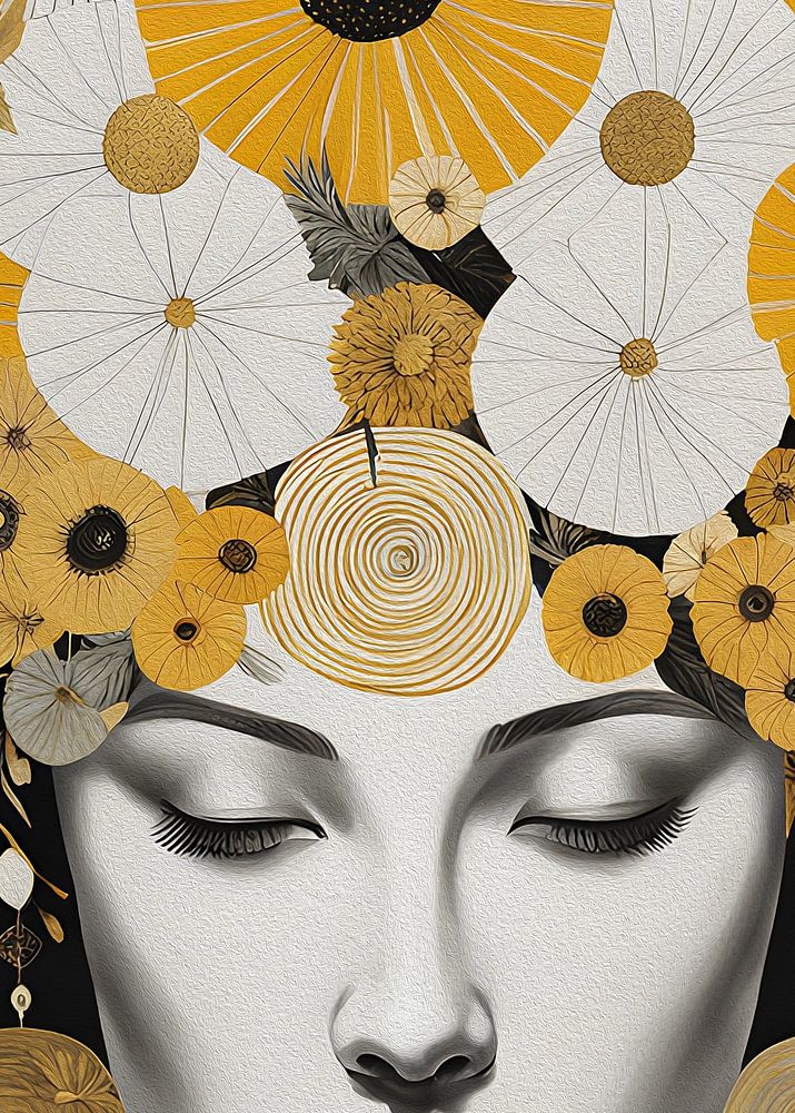 Designed as an eye-catcher for your home, this striking artwork depicts an elegant portrait of a woman interwoven with captivating geometric shapes and golden yellow flowers. Her facial features are highlighted by the clean lines and shapes around her, while the flowers add a soft and organic touch to the whole. The combination of geometry and natural elements creates a harmonious interplay of contrasts, making the artwork feel both contemporary and timeless. This artwork will not only elevate the aesthetics of your space, but also create a sophisticated and captivating atmosphere that will capture the attention of any visitor.