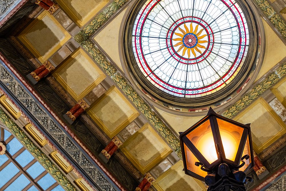 The richly decorated ceiling of the NS main railway station in the city of Groningen. The main railway station of Groningen, built in a virtuoso mixture of Renaissance and Gothic style elements, is one of the most beautiful railway buildings in the Netherlands. It was designed by Isaac Gosschalk. This photo was taken in the autumn of 2021.