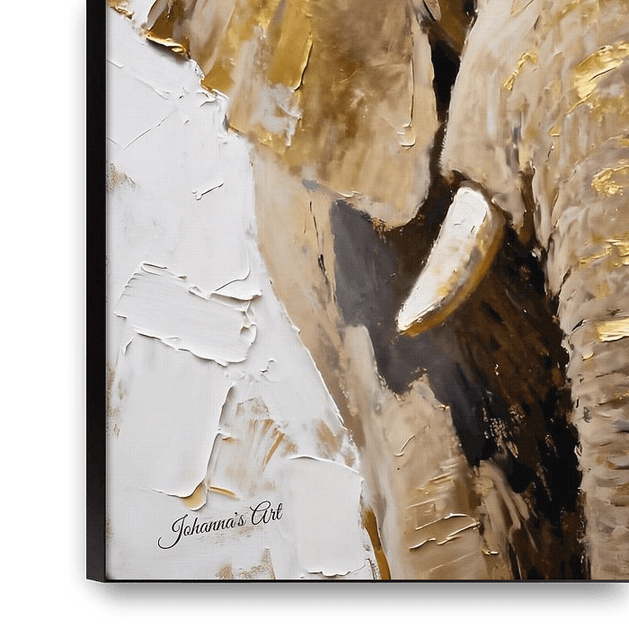 This striking piece from The Wildlife Collection presents a close-up view of an elephant, capturing its monumental presence with majestic intensity. Every wrinkle and contour of its skin is rendered with careful, expressive brushstrokes, bringing both texture and life to the canvas. Subtle golden highlights accentuate the natural form…