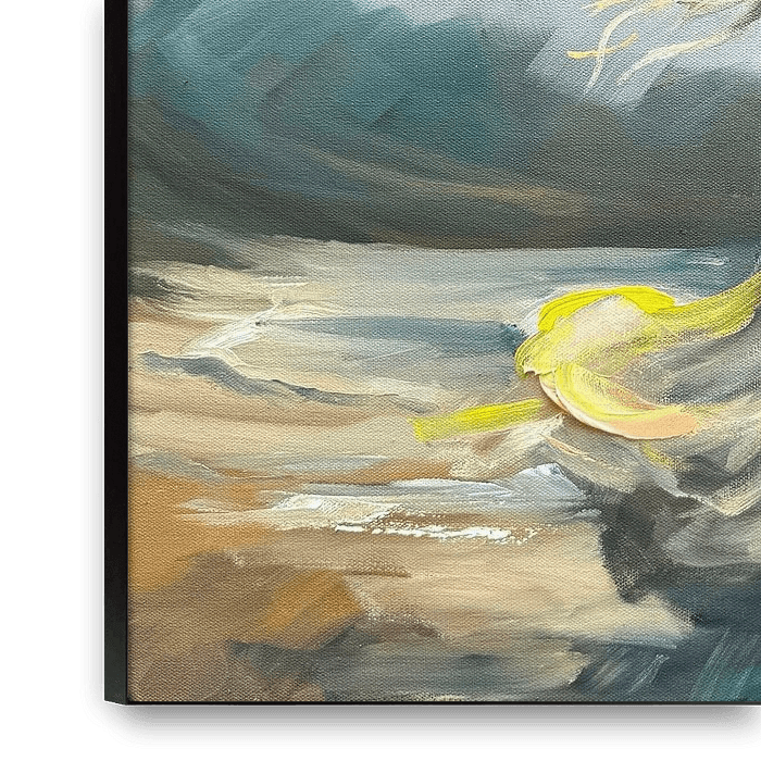 This captivating oil painting, drawing from the atmospheric drama of Impressionists like Turner and the enchanting folklore of Celtic realms, showcases a ethereal blonde woman embodying timeless elegance on the rugged beaches of Ireland or Scotland. In a flowing gown of soft gray tinged with luminous yellow that catches the fleeting…