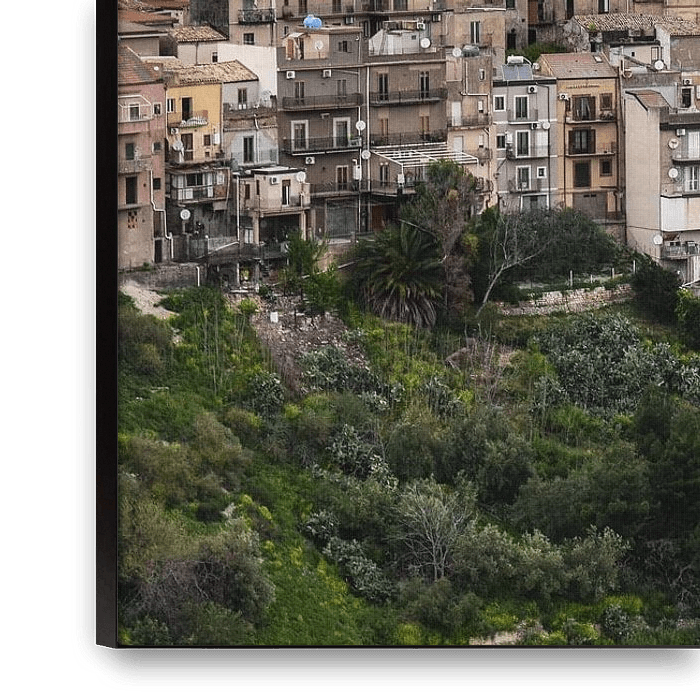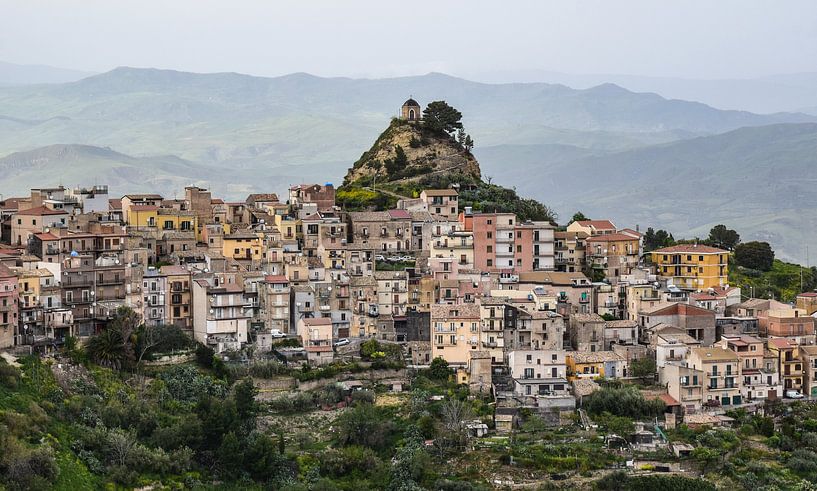 The little chapel on tiny Monte Calvario rises above the tall houses of Centuripe on the Italian island of Sicily.
