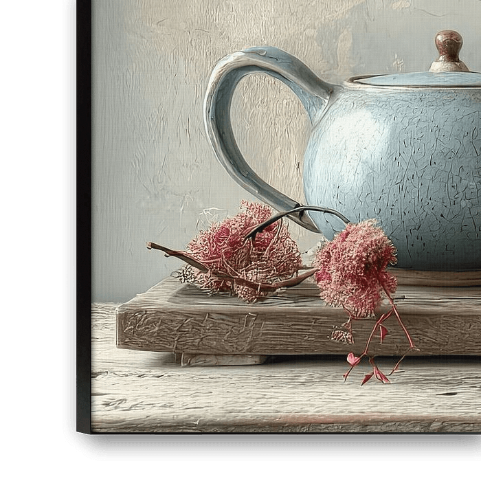 This still life with ceramic tableware and soft pink leaves feels calm and elegant, bringing a stylish, poetic atmosphere to your interior. The natural textures and serene colour palette evoke a sense of warmth and sophistication.