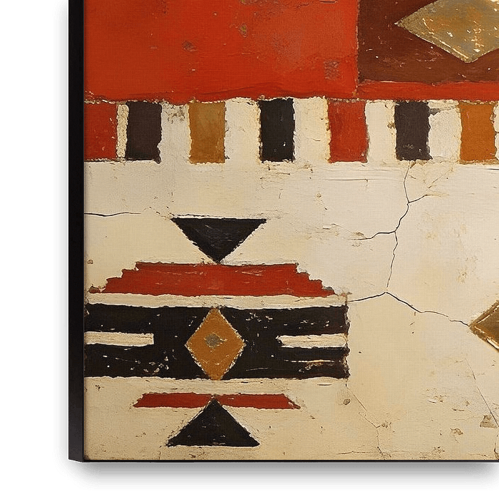 Inspired by Native American textile patterns and symbolism, this artwork translates tradition into a contemporary fine-art language. Without literal figures or direct representation, layered shapes and rhythmic forms emerge organically through paint, creating a respectful and abstracted visual narrative.