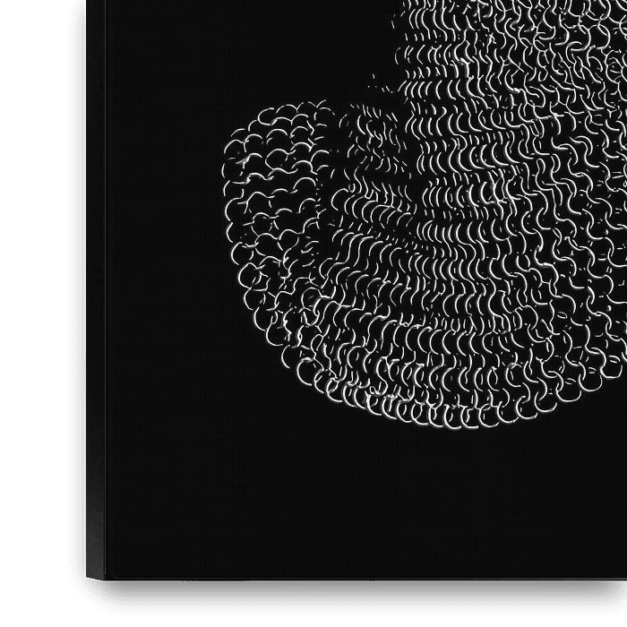 A dark, gritty tribute to medieval strength. This chainmail hood design on black evokes the spirit of a faceless knight ready for battle.