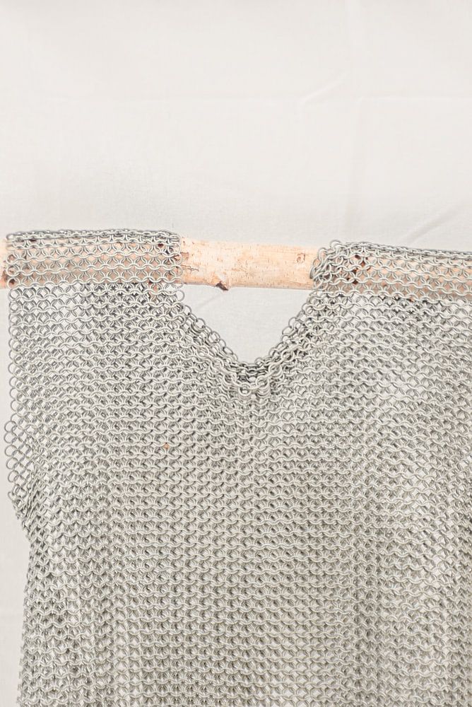 A picture of a chainmail hanging from a wooden construction and strings. The way of hanging , the cut-out and the pastel colours make this a work of art in itself.